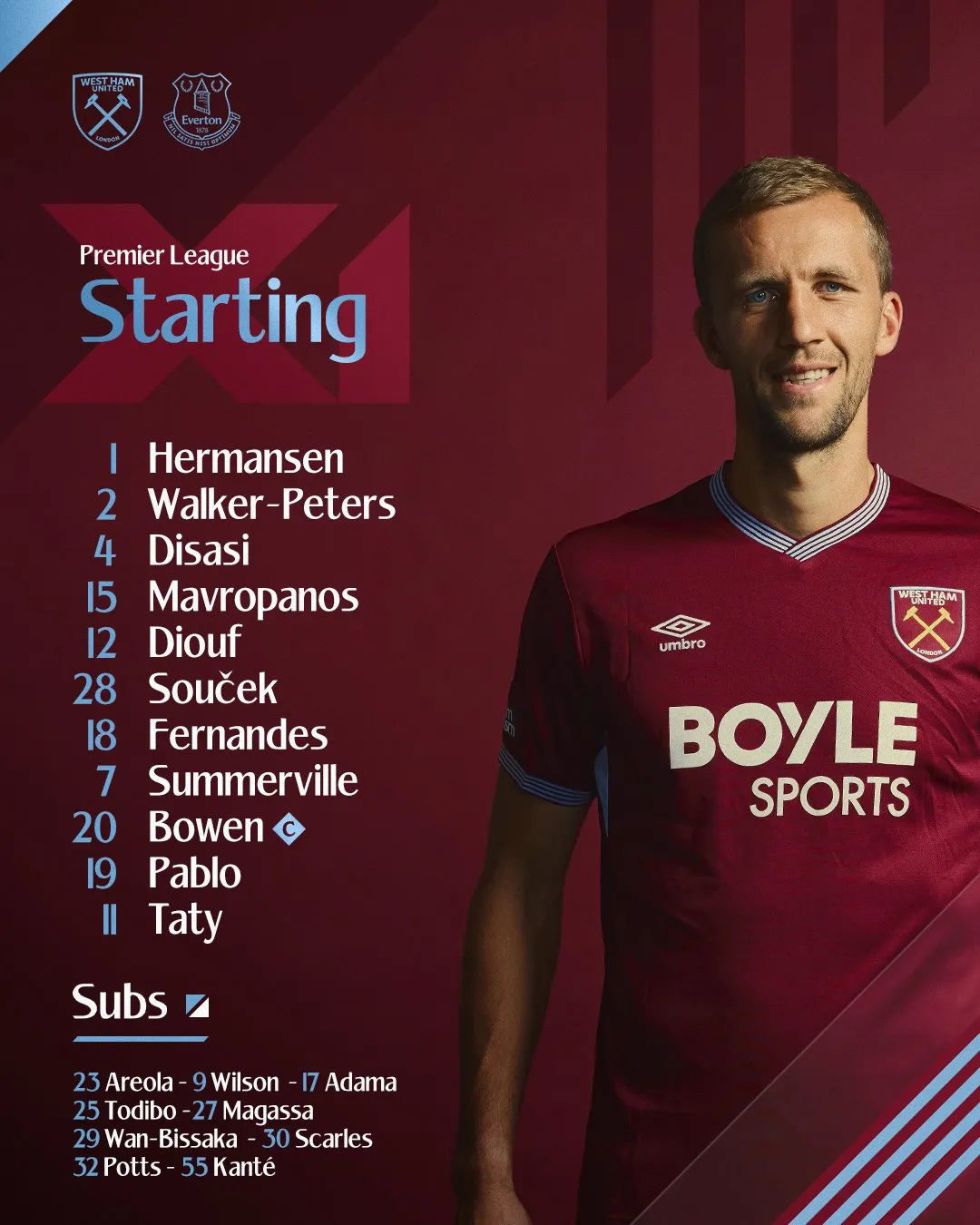 西汉姆联首发:1-赫尔曼森、2-沃克-彼得斯、15-马夫罗帕诺斯、4-迪萨西、7-萨默维尔、12-哈吉-迪乌夫、28-绍切克、18-马特乌斯-费尔南德斯、19-巴勃罗、20-鲍文、11-卡斯特利亚诺斯